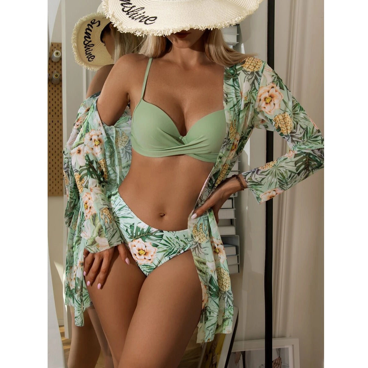 Long Sleeve Cover Up Split Three Piece Set Printed Swimwear